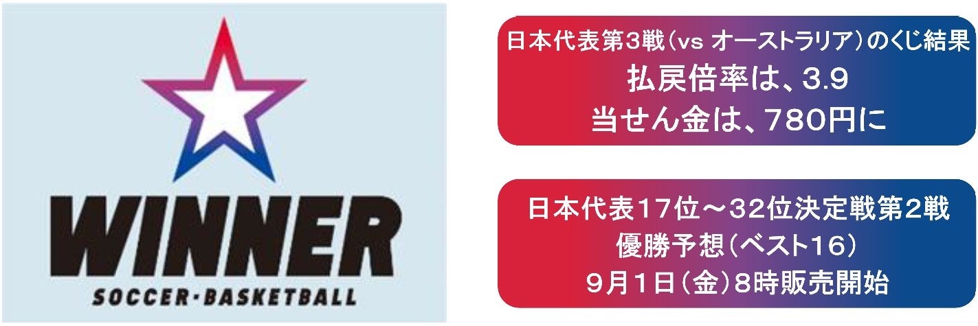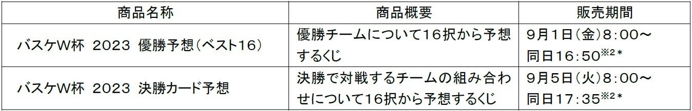 また、日本代表の17位~32位決定戦第2戦の「WINNERバスケ1試合予想」や2次ラウンドに進出した16か国を対象とした「バスケW杯 2023 優勝予想(ベスト16)」を、9月1日(金)8時から販売開始いたします。2次ラウンド以降の各試合の1試合予想も販売※いたしますので、引き続き、バスケットボールワールドカップを対象としたWINNERをお楽しみださい。