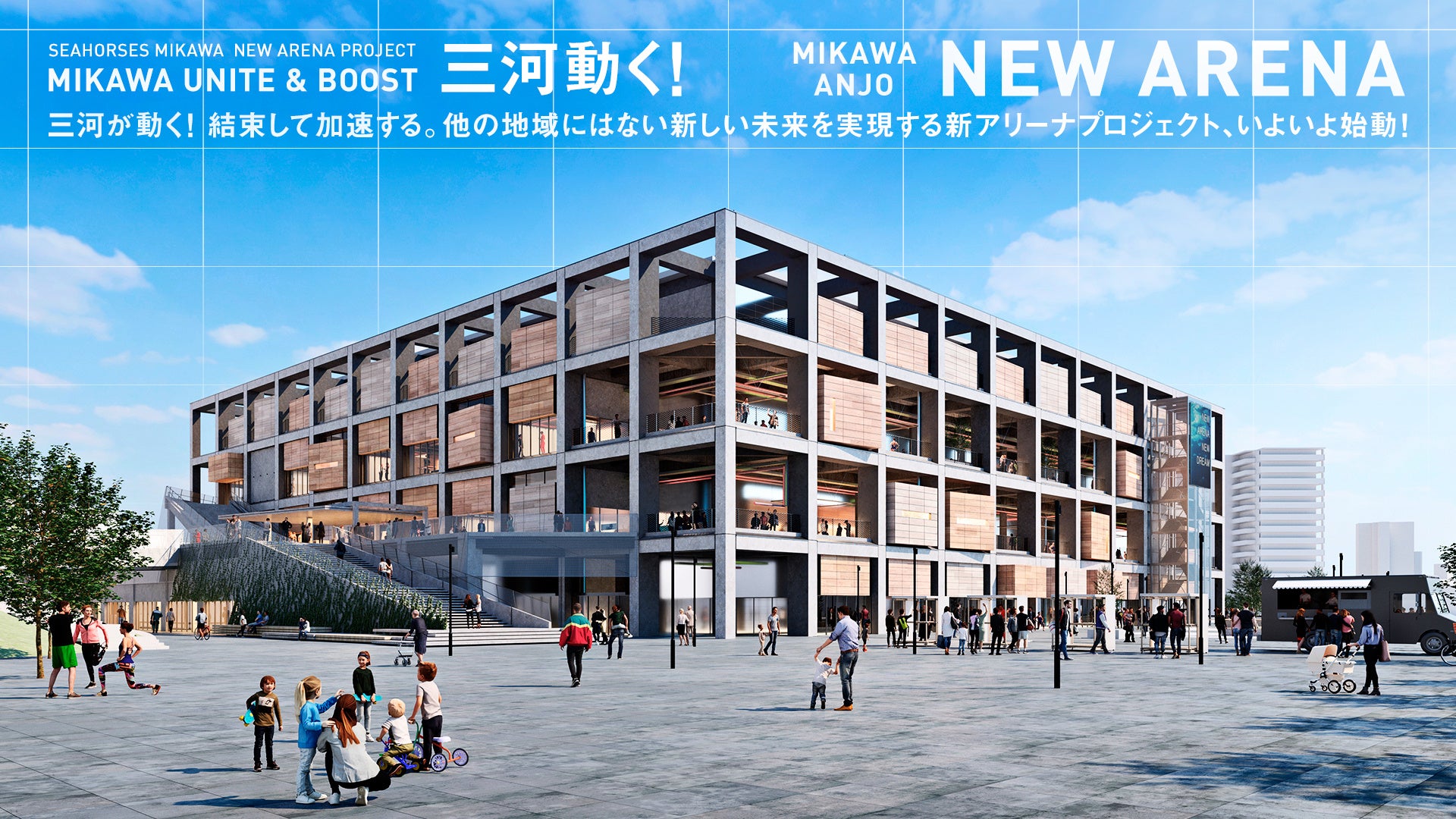 西三河全域の賑わい創出や、将来に渡るまちづくりに貢献していけるよう、新アリーナに関する具体的な検討と準備を進めており、安城市が考える「三河安城駅周辺のまちづくり」とも連携を深めて推進してまいります。