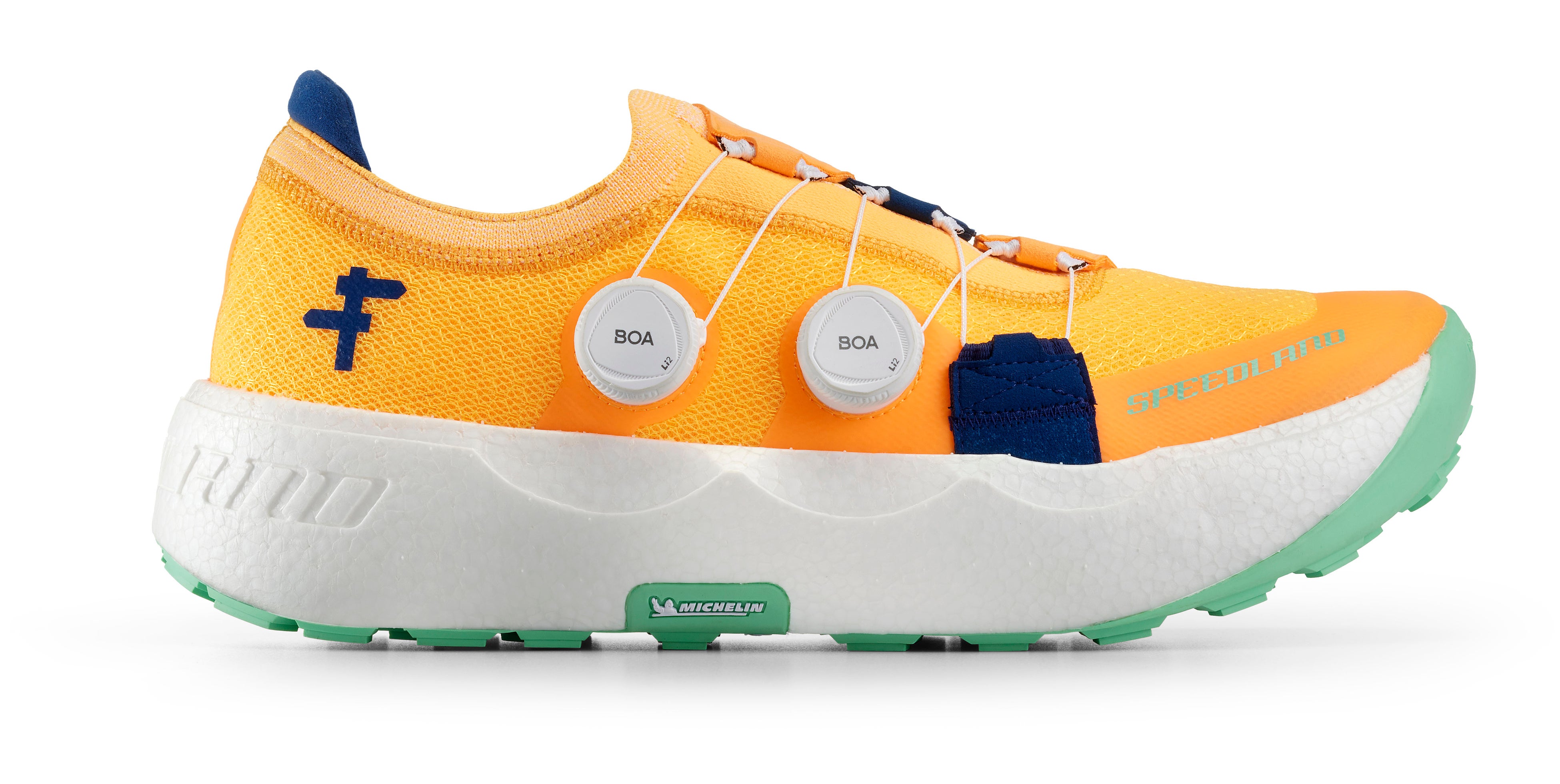 またトレイルランナーは、デュアルダイヤル BOA 構成を利用することで、BOA® PerformFit Wrap の特有の利点をさらに高めることができます。 この構成は、シューズのアッパーの複数のゾーンに微調節機能を提供し、各アスリートの固有の足の形状に合わせた確実なフィット感とトーボックス内のスペースの増加を実現します。これは、長距離中に自然な足の位置を維持するのに特に有益です。