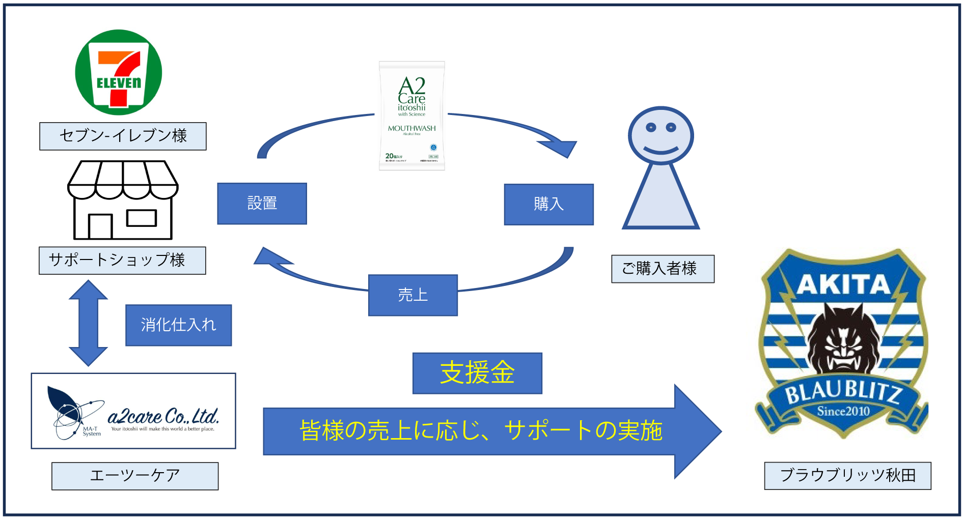 セブン-イレブンで販売しているA2Care商品を購入いただく事で、収益の一部をブラウブリッツ秋田の支援金としてサポートし、新スタジアム移設や練習場の整備費とさせていただきます。