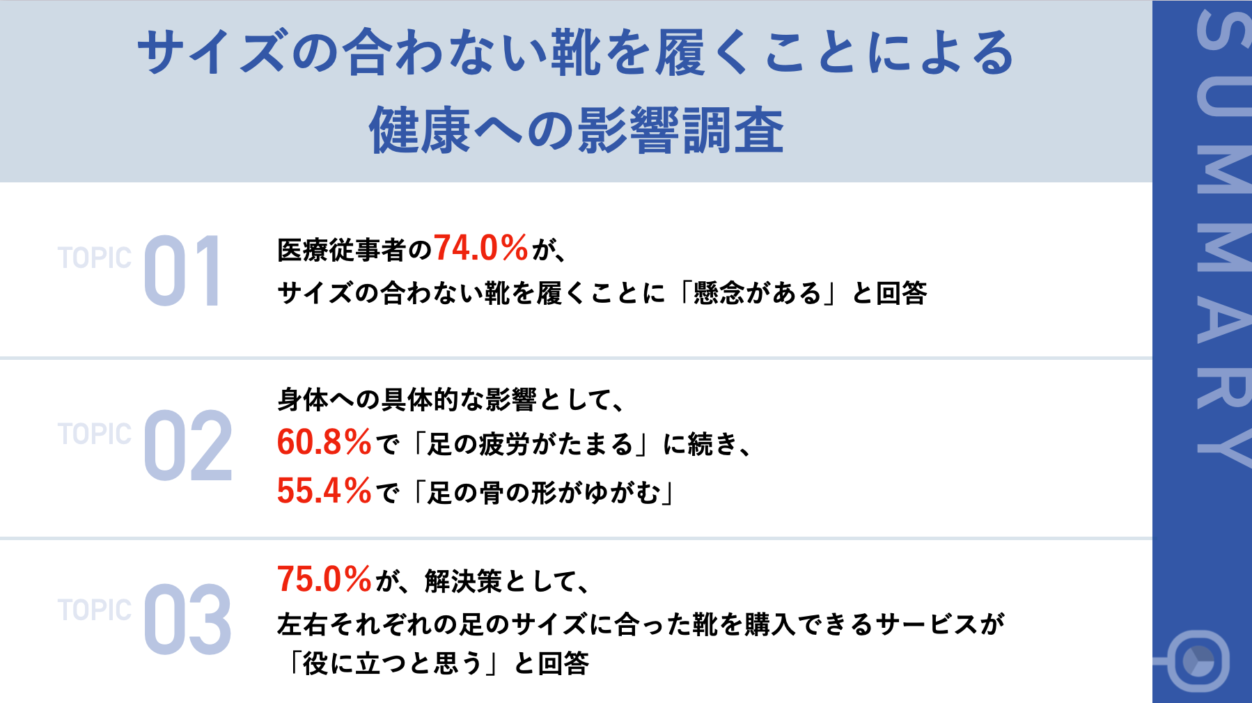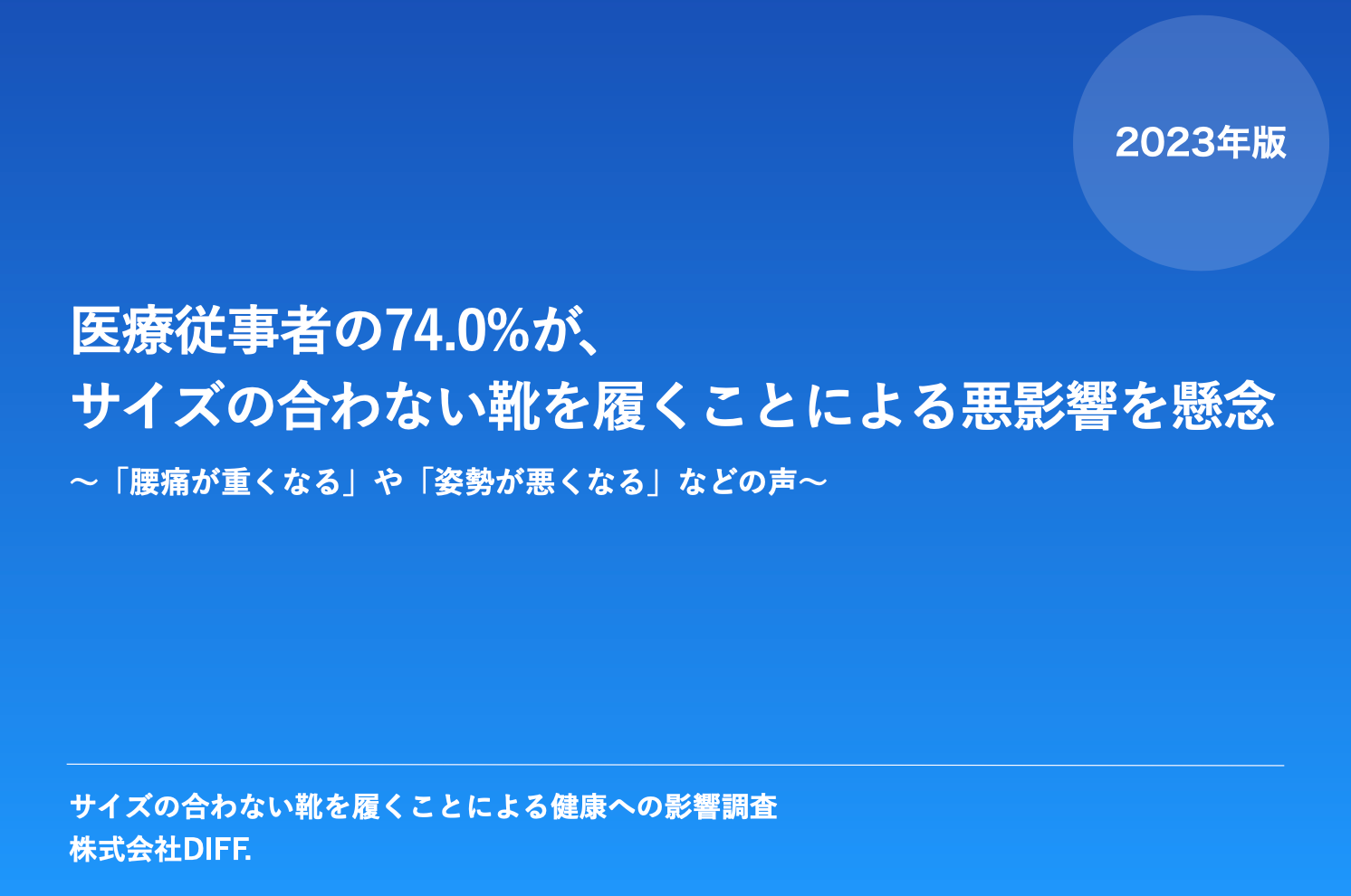 今回は、医療従事者(あん摩マッサージ指圧師、きゅう師、はり師、柔道整復師、理学療法士)100名を対象に、サイズの合わない靴を履くことによる健康への影響調査を実施しました。