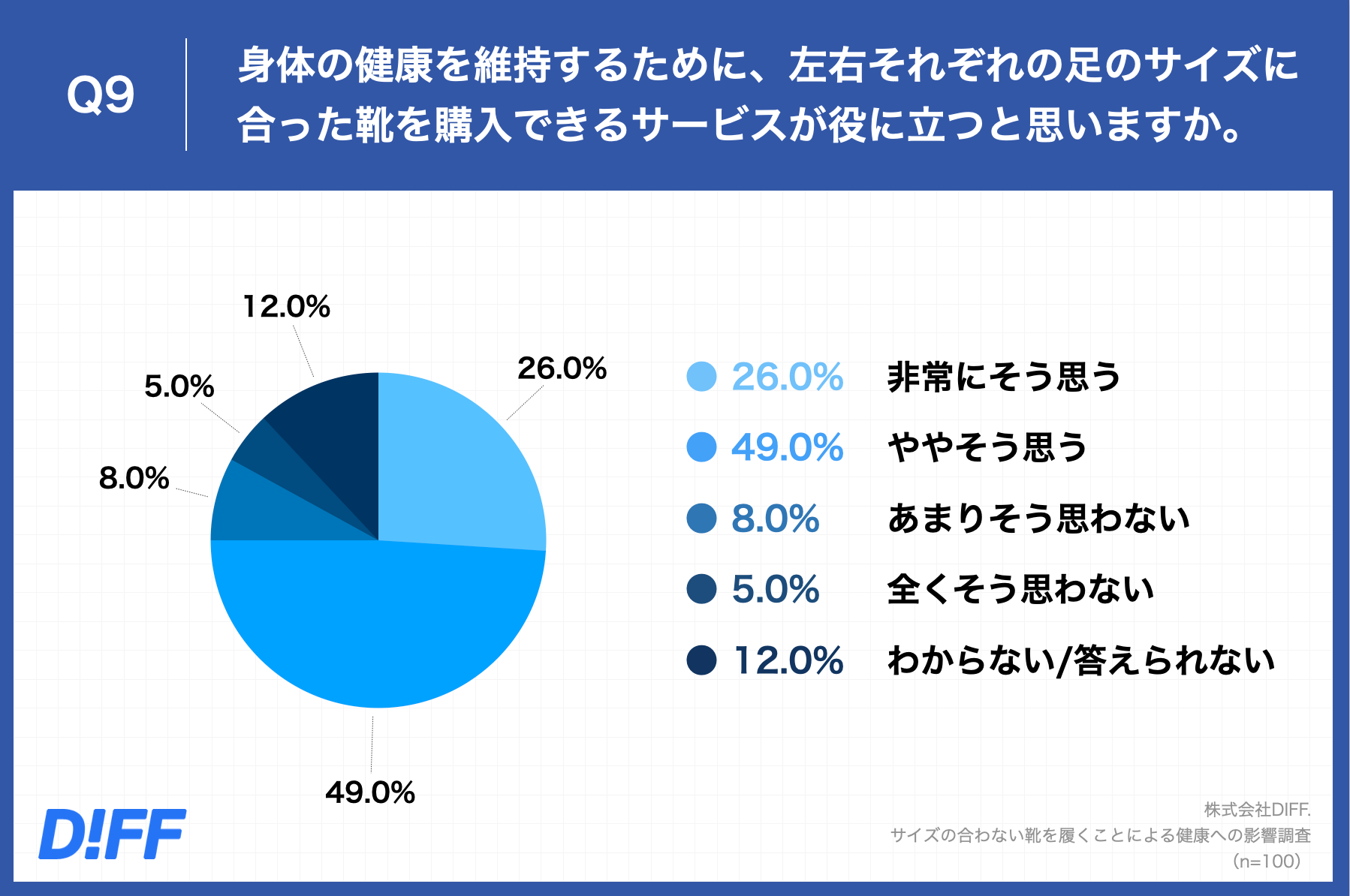 「Q9.身体の健康を維持するために、左右それぞれの足のサイズに合った靴を購入できるサービスが役に立つと思いますか。」(n=100)と質問したところ、「非常にそう思う」が26.0%、「ややそう思う」が49.0%という回答となりました。