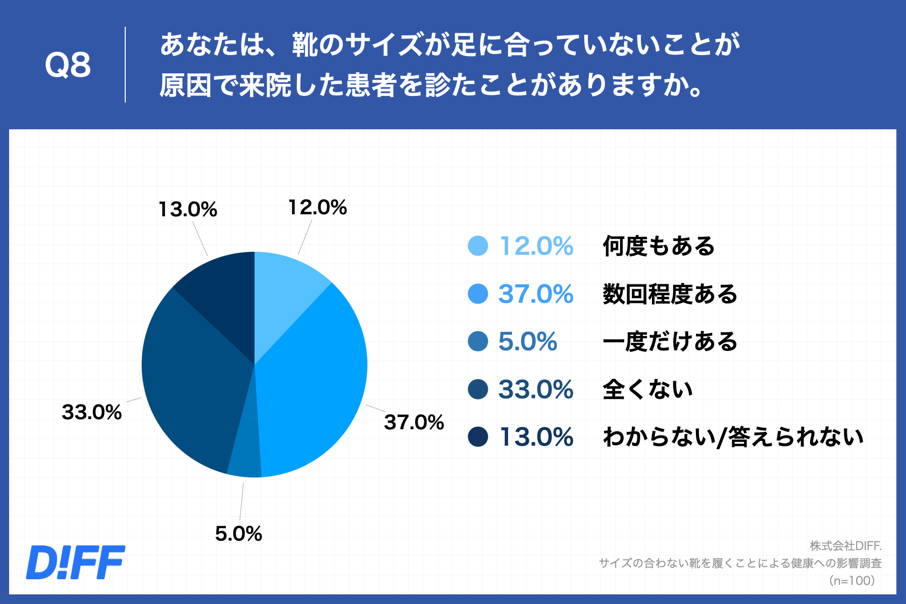「Q8.あなたは、靴のサイズが足に合っていないことが原因で来院した患者を診たことがありますか。」(n=100)と質問したところ、「何度もある」が12.0%、「数回程度ある」が37.0%、「一度だけある」が5.0%という回答となりました。