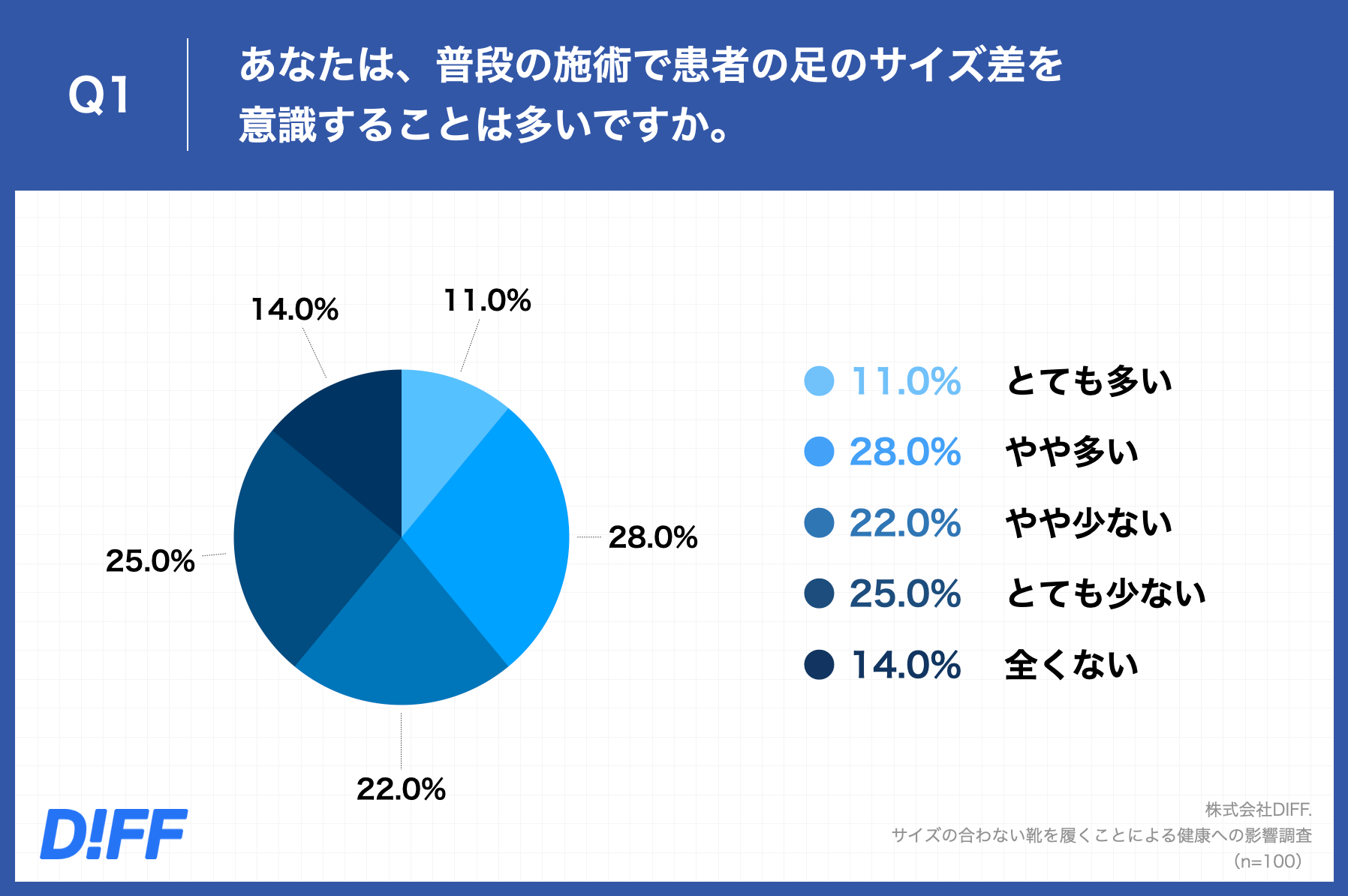 「Q1.あなたは、普段の施術で患者の足のサイズ差を意識することは多いですか。」(n=100)と質問したところ、「とても多い」が11.0%、「やや多い」が28.0%という回答となりました。