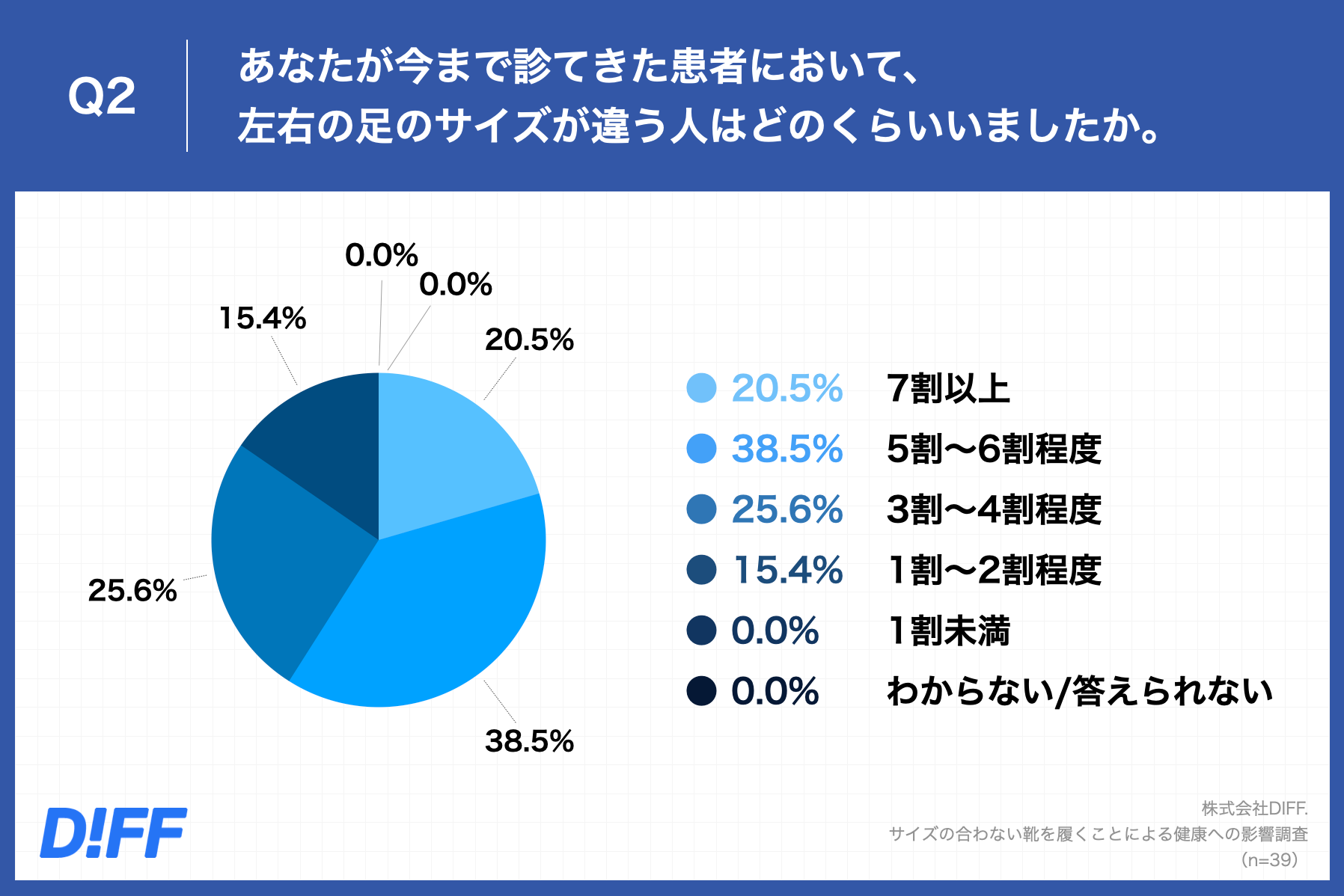 Q1で「とても多い」「やや多い」と回答した方に、「Q2.あなたが今まで診てきた患者において、左右の足のサイズが違う人はどのくらいいましたか。」(n=39)と質問したところ、「7割以上」が20.5%、「5割~6割程度」が38.5%という回答となりました。