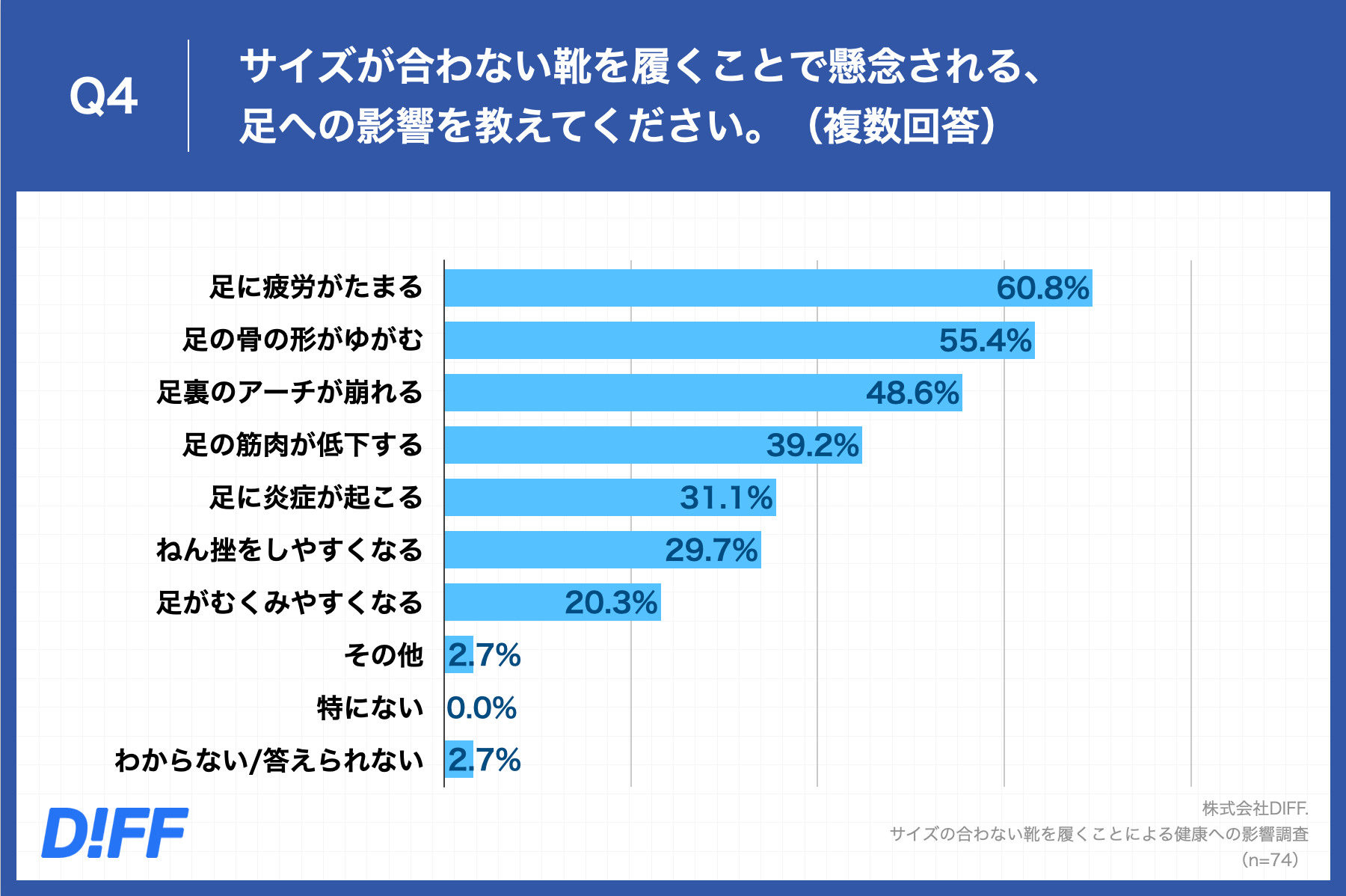 Q3で「非常にそう思う」「ややそう思う」と回答した方に、「Q4.サイズが合わない靴を履くことで懸念される、足への影響を教えてください。(複数回答)」(n=74)と質問したところ、「足に疲労がたまる」が60.8%、「足の骨の形がゆがむ」が55.4%、「足裏のアーチが崩れる」が48.6%という回答となりました。