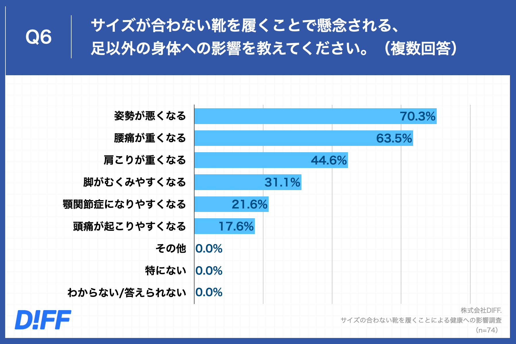 Q3で「非常にそう思う」「ややそう思う」と回答した方に、「Q6.サイズが合わない靴を履くことで懸念される、足以外の身体への影響を教えてください。(複数回答)」(n=74)と質問したところ、「姿勢が悪くなる」が70.3%、「腰痛が重くなる」が63.5%、「肩こりが重くなる」が44.6%という回答となりました。
