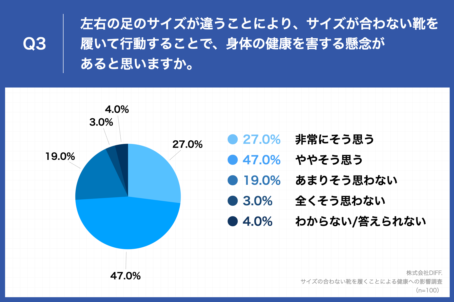 「Q3.左右の足のサイズが違うことにより、サイズが合わない靴を履いて行動することで、身体の健康を害する懸念があると思いますか。」(n=100)と質問したところ、「非常にそう思う」が27.0%、「ややそう思う」が47.0%という回答となりました。