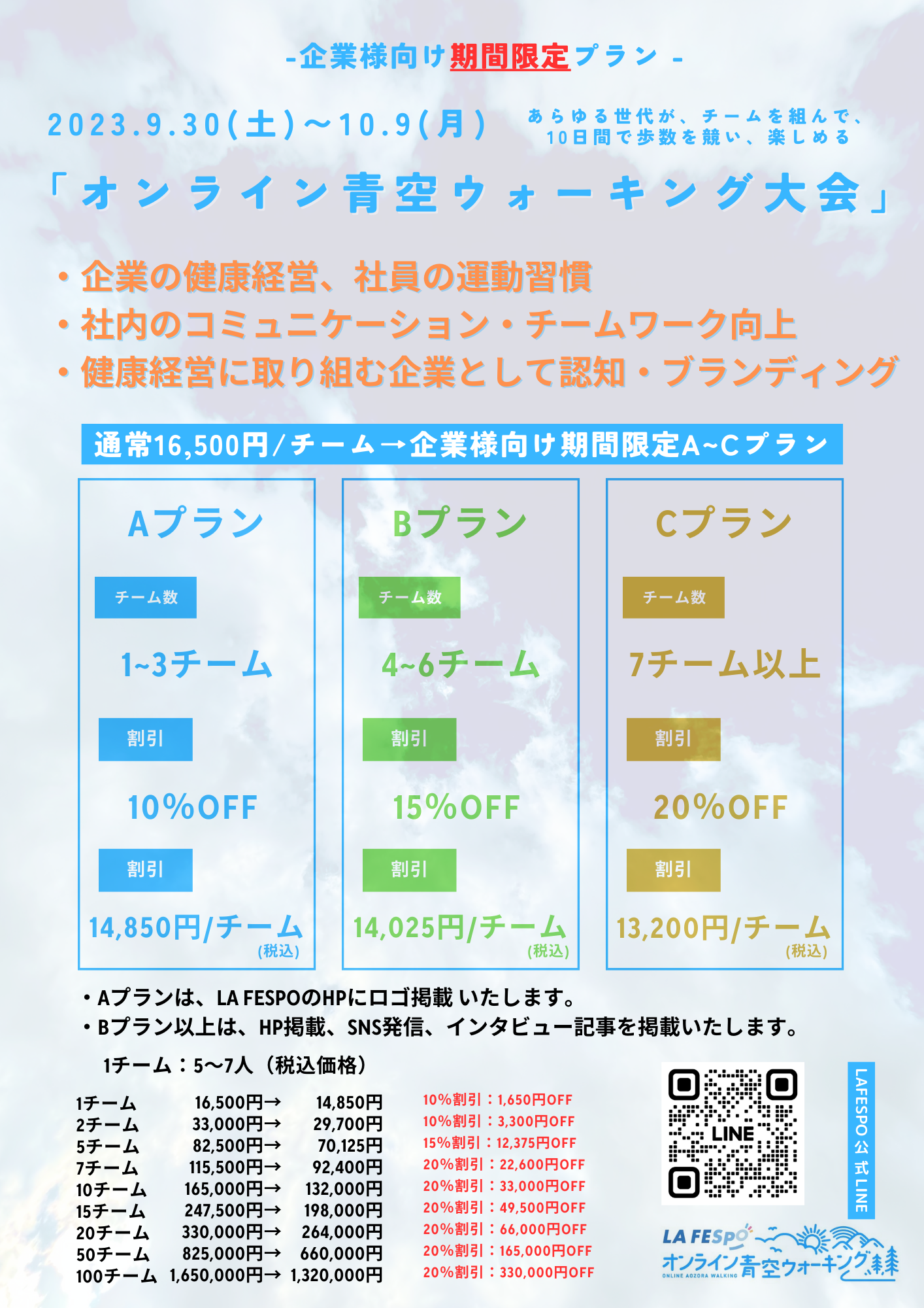 「ラフェスポオンライン青空ウォーキング」は、家族・地元の仲間・部活の仲間・趣味やサークルの仲間・会社の仲間などさまざまな人達とチームを作り、楽しむことができます。
