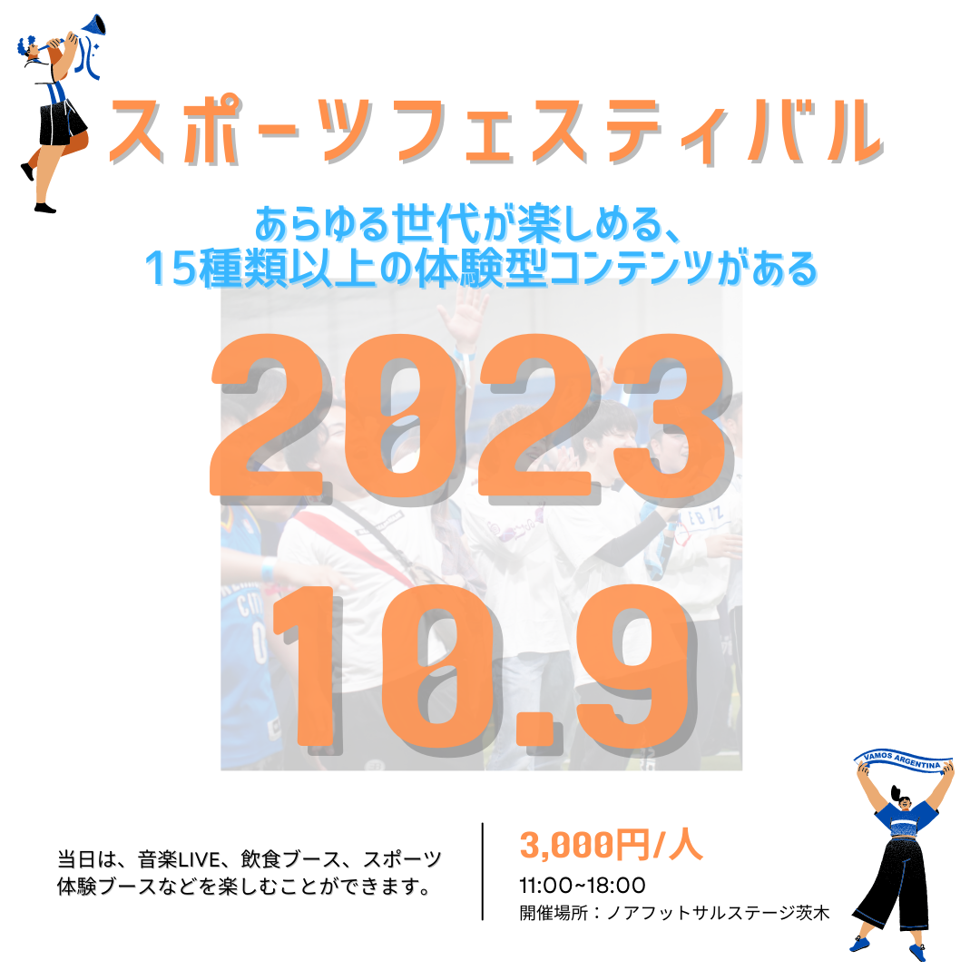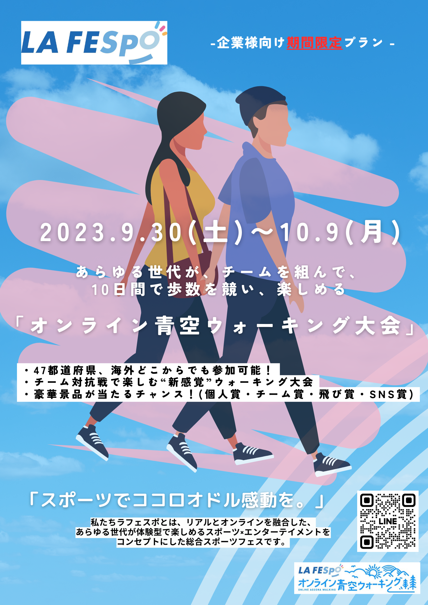 47都道府県好きな場所から参加できるオンライン青空ウォーキング(大会期間:2023年9月30日(土)〜10月9日(月・祝))1,000名規模、スポーツとエンターテイメントが一体化した総合スポーツフェス(2023年10月9日(月・祝)、大阪ノアフットサルステージ茨木にて開催)1,000名規模、合わせて総勢約2,000名が参加する、リアルとオンラインの融合したスポーツフェスが、ラフェスポです。