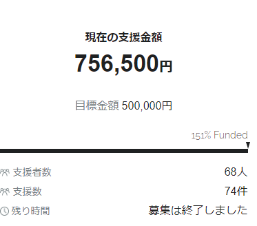 2023年6月16日から7月31日まで実施したプロジェクトは、74件もの支援をいただき、目標金額である500,000円を超え、756,500円を集めることができました。支援者の皆様には多大なる温かいご支援を頂き、深く御礼を申し上げます。