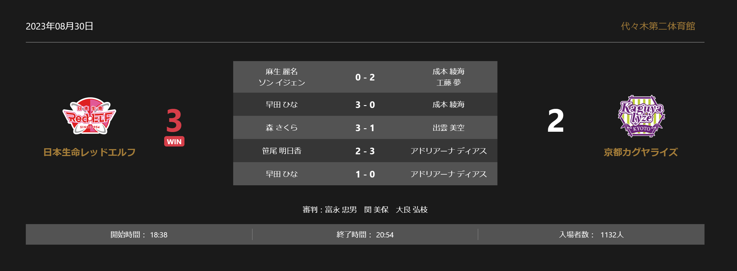ホームプレスリリース ノジマTリーグ 2023-2024シーズン 公式戦 8月30日開催 日本生命レッドエルフ vs 京都カグヤライズ 対戦結果 2023年08月31日 21時07分 公開|スポーツマニア編集部プレスリリース 一般社団法人Tリーグのプレスリリース ノジマTリーグ 2023-2024シーズン 公式戦 8月30日開催 日本生命レッドエルフ vs 京都カグヤライズ の対戦は、3-2で日本生命レッドエルフが勝利しました。