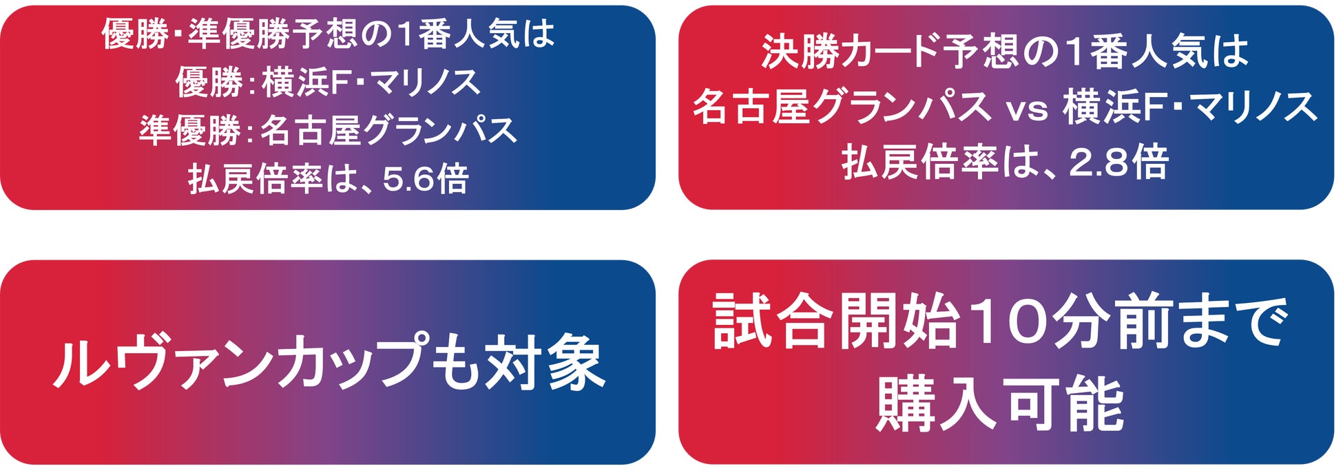 優勝・準優勝予想の1番人気は、優勝が2001年大会以来2回目の優勝を目指す横浜F・マリノス、準優勝が2021年大会以来2回目の優勝を目指す名古屋グランパスで、払戻倍率(オッズ)は5.6倍!2番人気は、優勝が名古屋グランパス、準優勝が横浜F・マリノスで、払戻倍率(オッズ)は6.3倍、3番人気は、優勝が横浜F・マリノス、準優勝が2015年大会以来7回目の優勝を目指す鹿島アントラーズで、払戻倍率(オッズ)は6.9倍、となっています。