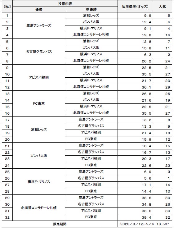 ※1 9月1日(金)10時時点の投票状況となります。払戻倍率(オッズ)は、投票状況により販売終了まで変動します。払戻倍率(オッズ)は、スポーツくじオフィシャルサイト(https://www.toto-dream.com/)で随時更新しています。