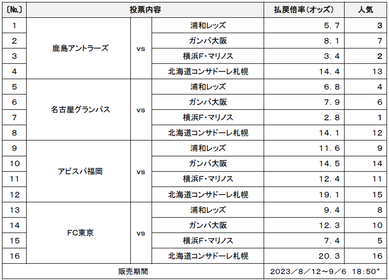 ※1 9月1日(金)10時時点の投票状況となります。払戻倍率(オッズ)は、投票状況により販売終了まで変動します。払戻倍率(オッズ)は、スポーツくじオフィシャルサイト(https://www.toto-dream.com/)で随時更新しています。