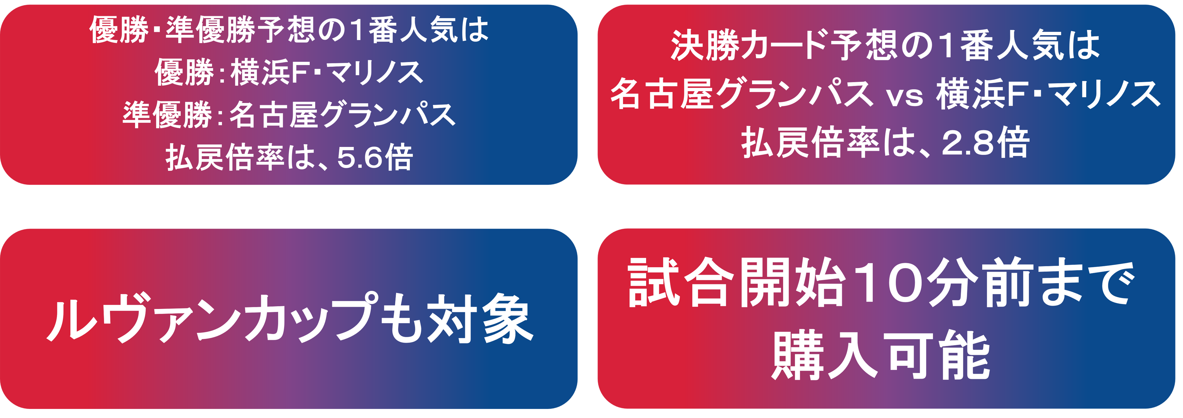 優勝・準優勝予想の1番人気は、優勝が2001年大会以来2回目の優勝を目指す横浜F・マリノス、準優勝が2021年大会以来2回目の優勝を目指す名古屋グランパスで、払戻倍率(オッズ)は5.6倍!2番人気は、優勝が名古屋グランパス、準優勝が横浜F・マリノスで、払戻倍率(オッズ)は6.3倍、3番人気は、優勝が横浜F・マリノス、準優勝が2015年大会以来7回目の優勝を目指す鹿島アントラーズで、払戻倍率(オッズ)は6.9倍、となっています。