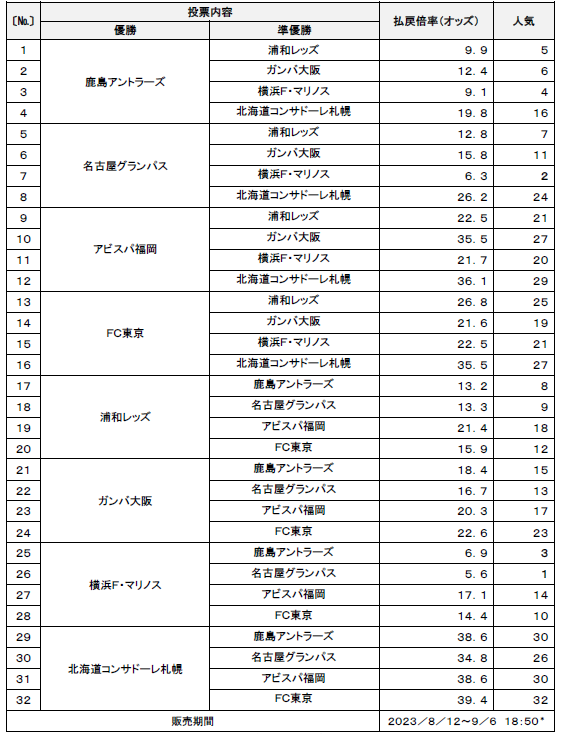 決勝カード予想の1番人気は、「名古屋グランパス vs 横浜F・マリノス」で、払戻倍率(オッズ)は2.8倍!2番人気は、「鹿島アントラーズ vs 横浜F・マリノス」で、払戻倍率(オッズ)は3.4倍、3番人気は、「鹿島アントラーズ vs 浦和レッズ」で、払戻倍率(オッズ)は5.7倍、となっています。