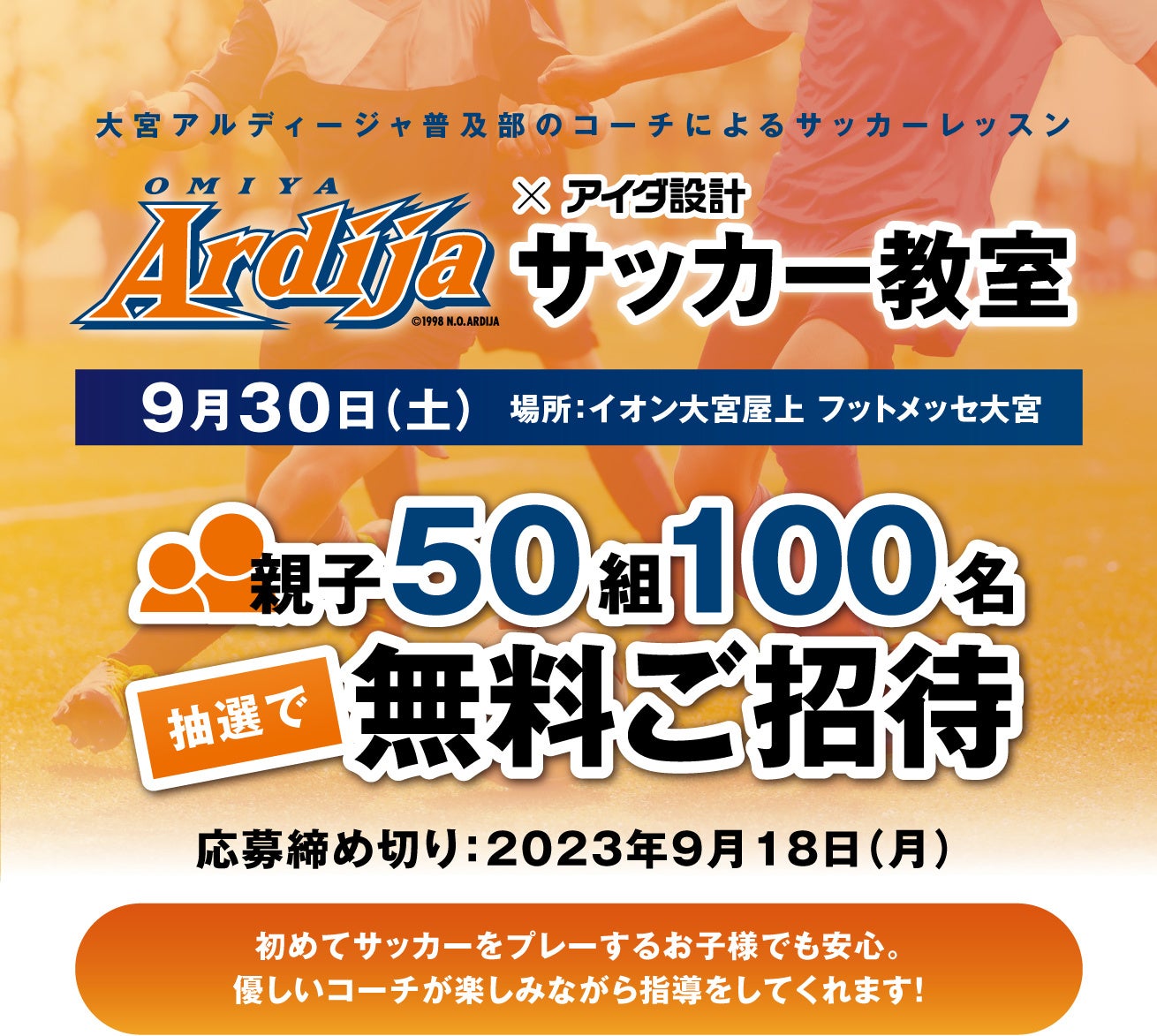 この度、アイダ設計は「幼稚園年中~小学校4年生」に在学中のお子様がいるご家族の親子最大50組合計100名様(1組4名様まで)を対象に、大宮アルディージャ普及部のコーチによるサッカー教室を開催します。当日はサッカーボールの無料貸し出しも行っており、初心者や女の子も安心してご参加いただけます。また、参加特典として、「大宮アルディージャ×アイダ設計コラボグッズ」を用意しております。