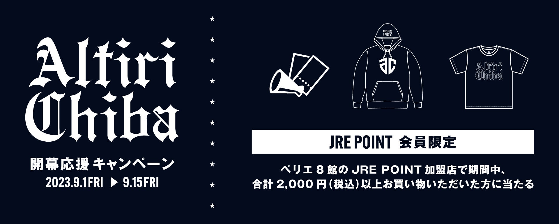 期間中、JRE POINT WEBサイト、JRE POINTアプリからエントリーの上、ペリエ8館の対象ショップで、JRE POINTが貯まるカードまたはバーコードをご提示いただき、合計2,000円(税込)以上お買い物をお楽しみいただいた方の中から、抽選で10月7日(土)のアルティーリ千葉開幕戦チケットやアルティーリ千葉オフィシャルグッズをプレゼントいたします。