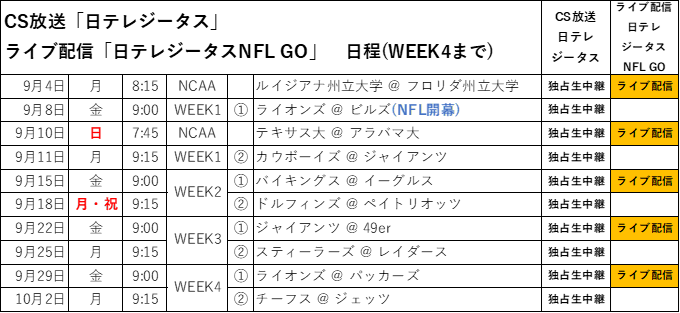 もちろん10月以降も、NFL,NCAAカレッジフットボールの生中継、ライブ配信は続きます。