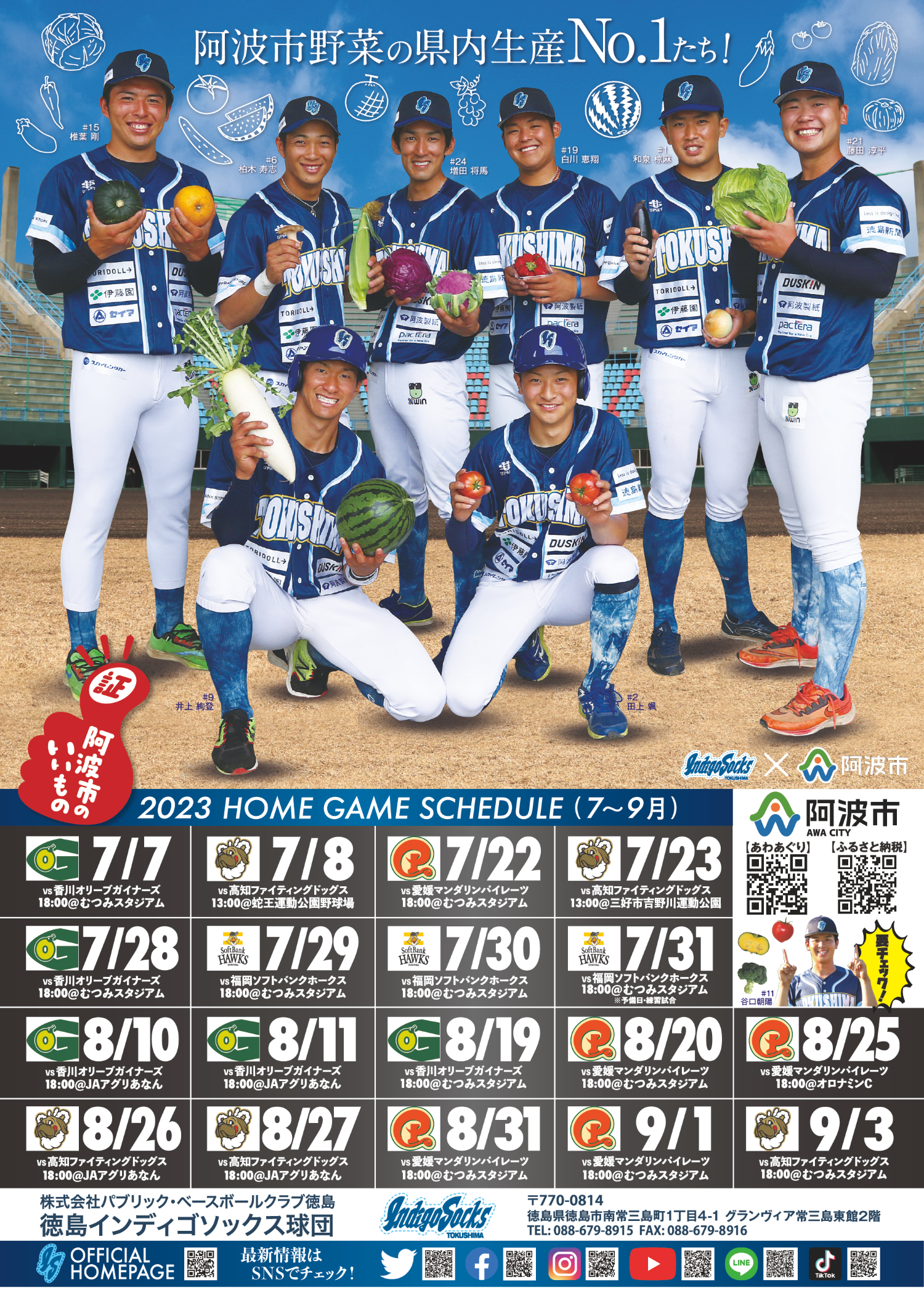 阿波市様には、いつも私たち選手が練習に着用しているオフィシャルTシャツや後期ポスターなどの取り組みにご理解頂き、インディゴソックスは、阿波市の野菜の広報活動にご協力させて頂いております。