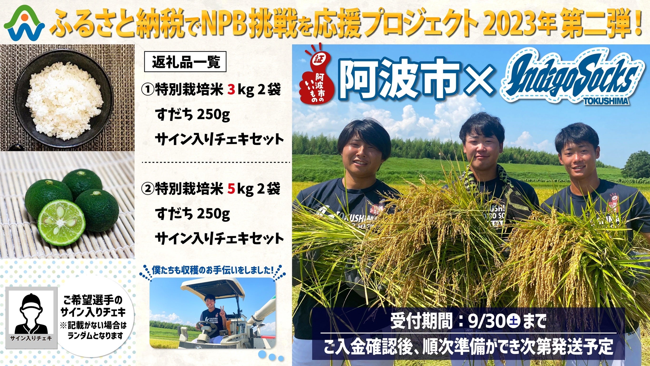 阿波市のふるさと納税を取り扱っているサイトは複数ありますが、今回、ふるさと納税サイト「ふるさとチョイス」では、返礼品として阿波市の新鮮な農作物以外にインディゴソックス選手のサイン入りチェキが特典としてセットとなります!