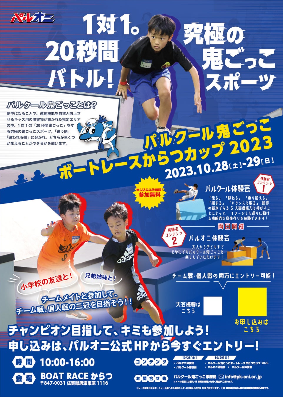 BOAT RACEからつで開催される「パルクール鬼ごっこボートレースからつカップ2023 」では、「あそびがカラダを作る!」をテーマに、パルクール鬼ごっこで楽しさとともに能力を向上させる、小学生以下及びその保護者を対象とした限定のイベントを10月28日(土)から10月29日(日)まで2日間に渡り開催!