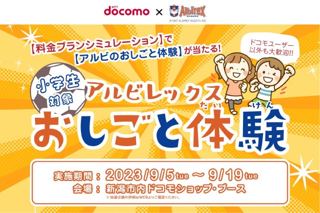当クラブオフィシャルクラブパートナーの株式会社ドコモCS 新潟支店では、キャンペーン実施期間中に、対象店舗で料金シミュレーションをすると、抽選で9月23日(土・祝)のホームゲーム、横浜FC戦の開始前に、デンカビッグワンスタジアム内で実施される「アルビの舞台でジブンを見つける!アルビレックスおしごと体験イベント」に、抽選で40組80名様をご招待するキャンペーンを実施します。