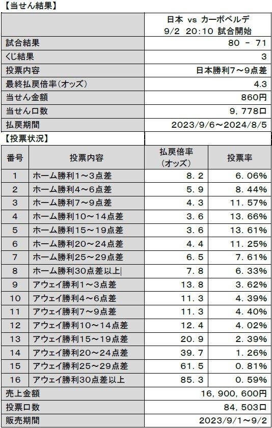 ・17位~32位決定戦第2戦(vs カーボベルデ)は、7~9点差で日本勝利となり、払戻倍率(オッズ)は4.3倍、当せん金額は860円となりました。全16選択肢のうち最も多かった投票内容は、10~14点差で日本勝利、払戻倍率(オッズ)は3.6倍となった中、3番目に投票の多かった結果となりました。