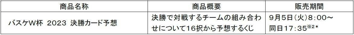 また、準々決勝に進出した8か国の中から決勝の対戦カードを予想する「バスケW杯 2023 決勝カード予想」を、9月5日(火)8時〜17時35分で販売いたします。準々決勝以降の各試合の1試合予想も販売※いたしますので、引き続き、バスケットボールワールドカップを対象としたWINNERをお楽しみださい。