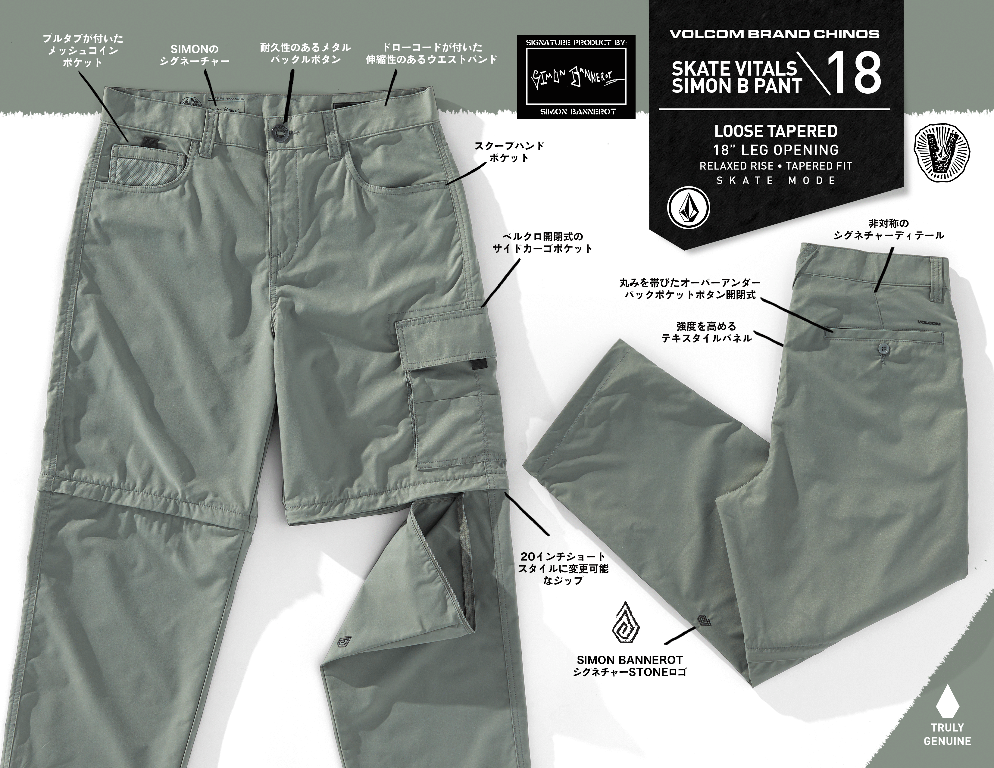 90 年代のスタイルからヒントを得たこの Skate Vitals パンツは、ルーズフィットスタイルでテイパード仕様となっている。驚くほどのストレッチ素材と軽量化された生地により、オーリーの時の引っかかりも全く気にならない。ジップオフで簡単にショーツに早変わりするのも嬉しい。裾にはドローコードも付いているので、踏んでトリックの妨げになることもない。左足下部には、サイモンのシグネチャーストーンもアクセントになる。