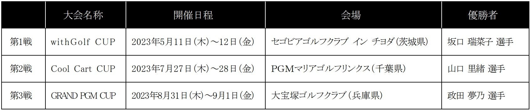パシフィックゴルフマネージメント株式会社(本社:東京都台東区東上野/代表取締役社長 田中 耕太郎、以下「PGM」)は、株式会社マイナビと、株式会社ALBA、株式会社ALBA TVが主催する『2023マイナビネクストヒロインゴルフツアー』(以下、「本大会」)にスポンサーとして参入し、PGMシリーズとして3試合を開催しました。PGMシリーズ3試合のマイナビポイント合計が最上位となった政田 夢乃選手にPGMスポンサーシップ契約の権利を付与しました。