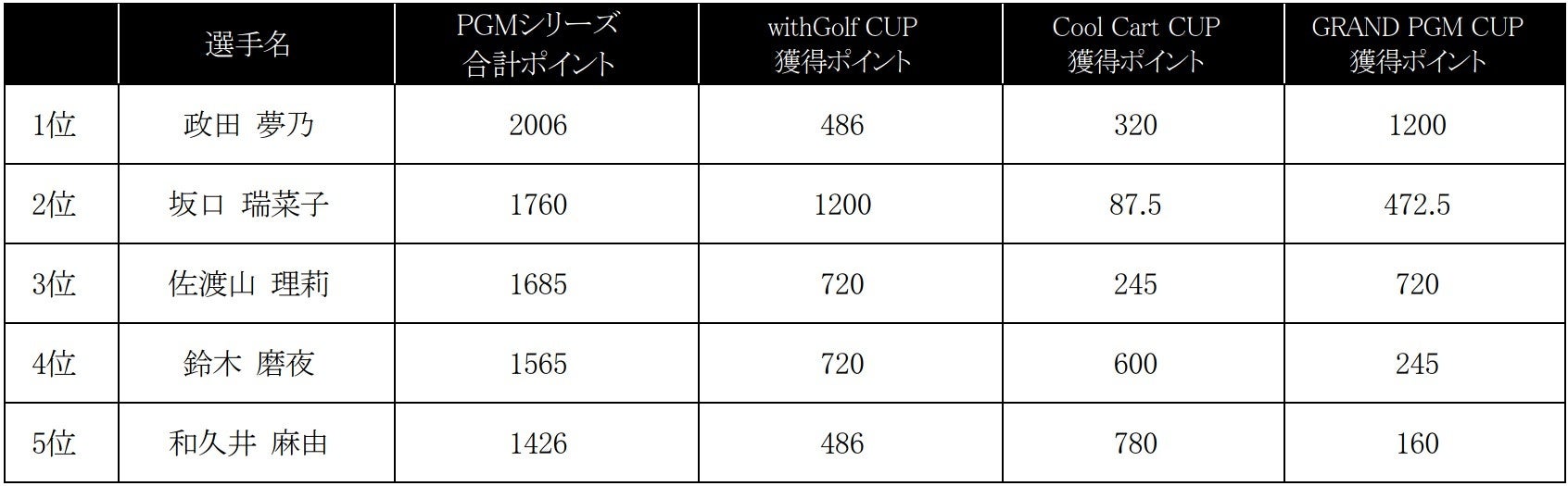 PGMシリーズ3試合でのマイナビポイント順位