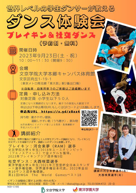 このたび、ともに文京区に位置し世界で活躍するプロダンサーを学生として持つ本学と東洋学園大学の共催で、ブレイキンと社交ダンスの体験を目的とした小学生以下が対象のダンス教室を開催します。