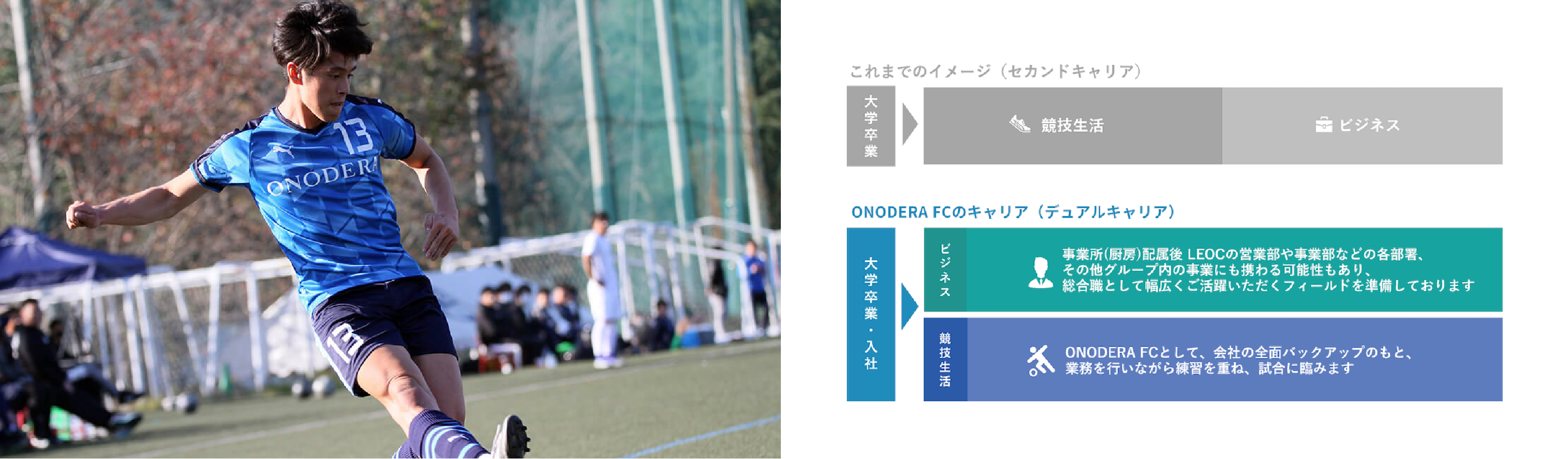 ONODERA FCは2013年に創部。全国2,800カ所以上で給食サービスを展開する株式会社LEOCをはじめ、ONODERA GROUP各事業で正社員として勤務しながらサッカーに打ち込めるデュアルキャリアが大きな特徴です。平日午前中は勤務扱いとして練習に取り組み、午後は各社で勤務。チームは神奈川県社会人サッカー2部リーグに所属しており、JFL(日本フットボールリーグ)昇格を目指します。