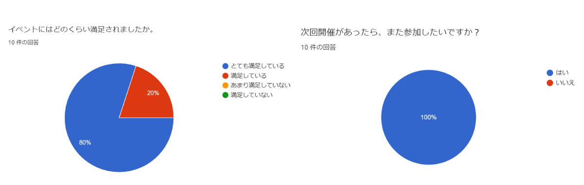 本イベントの参加者16名に、アンケート(※)を実施したところ、満足度は100%、「次回があったら参加したいか」の設問にも100%の方が「はい」と回答しました。