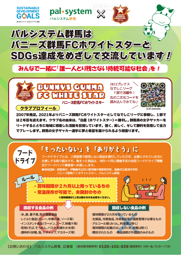 県内女子サッカーをけん引するバニーズ群馬FCホワイトスターは、地域のSDGs達成を目指してパルシステム群馬と交流しています。今回のフードドライブは、サッカーの魅力を通じてより多くの人たちへ食品提供を呼びかけるため合同開催が実現しました。家庭の食品ロス削減や生活困窮者支援など、SDGs実現に欠かせない課題に取り組みます。
