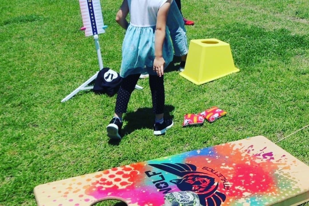 コーンが入った小さな袋を傾斜をつけた板の上にある穴めがけて投げ入れるスポーツです。2人または2チームでプレイし、交互に布袋を投げてスコアを競います。