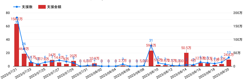 ▼支援募集期間を通じた支援数(折れ線)、及び支援金額(棒線)