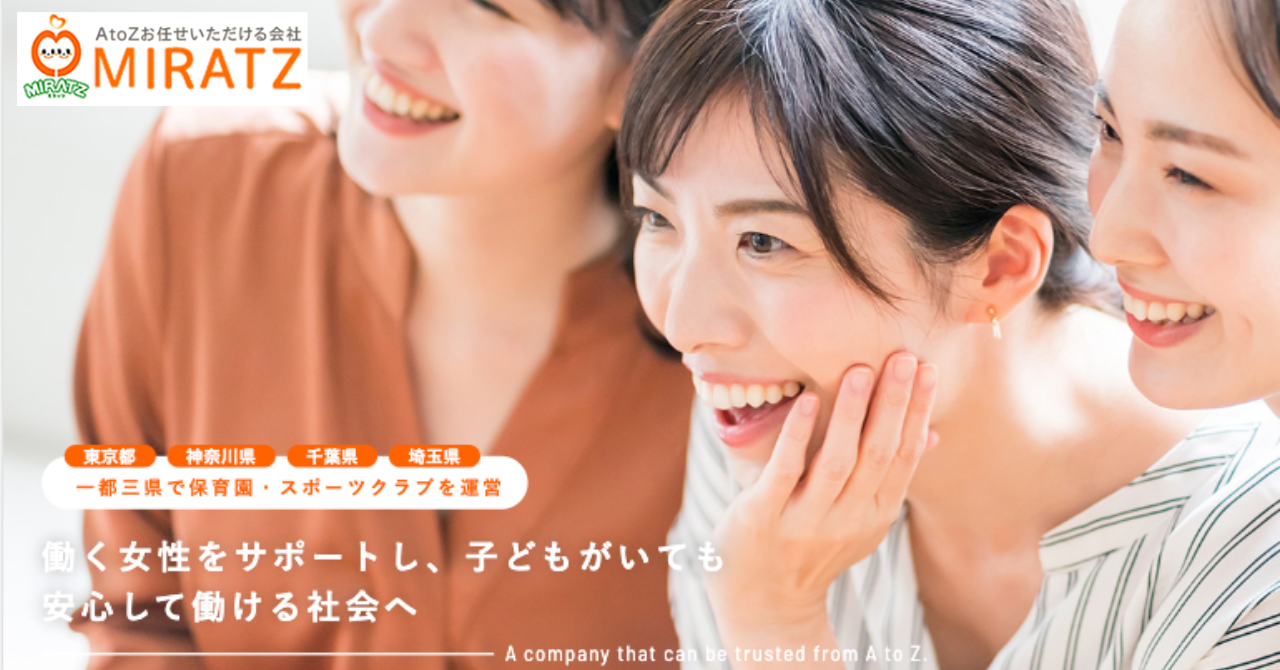 株式会社MIRATZは、働く⼥性をサポートし、⼦どもがいても安⼼して働ける社会の実現に向けて、都内近郊を中⼼に直営の保育園・スポーツクラブを運営しております。未来を担う⼦どもたちのために、すべてを任せていただける組織を⽬指して、地域の⼦育てサポートや情報交流の場を提供しています。