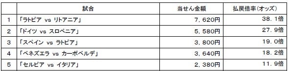 ・決勝の対戦カードは「ドイツ vs セルビア」となり、払戻倍率(オッズ)は7.7倍、当せん金額は1,540円となりました。