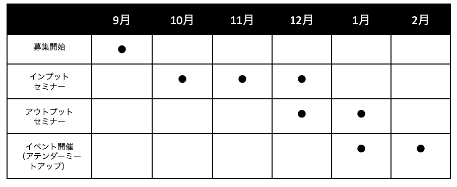 本プロジェクトでは、以下の内容で「インプットセミナー」「アウトプットセミナー」「イベント開催(アテンダーミートアップ)」を推進していきます。