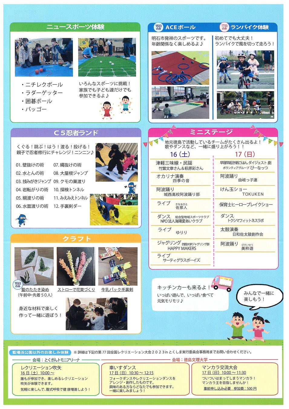 誰もが気軽にスポーツに親しむことができる機会の創出や、全国からの参加者との交流による地域活性化を図るため、国内最大規模の生涯スポーツとレクリエーションの祭典「第77回全国レクリエーション大会2023inとくしま」を開催します。