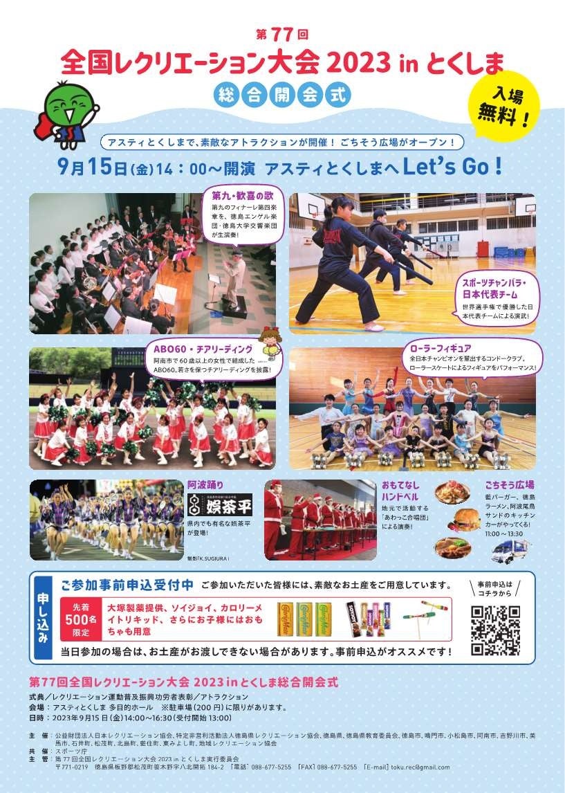 誰もが気軽にスポーツに親しむことができる機会の創出や、全国からの参加者との交流による地域活性化を図るため、国内最大規模の生涯スポーツとレクリエーションの祭典「第77回全国レクリエーション大会2023inとくしま」を開催します。