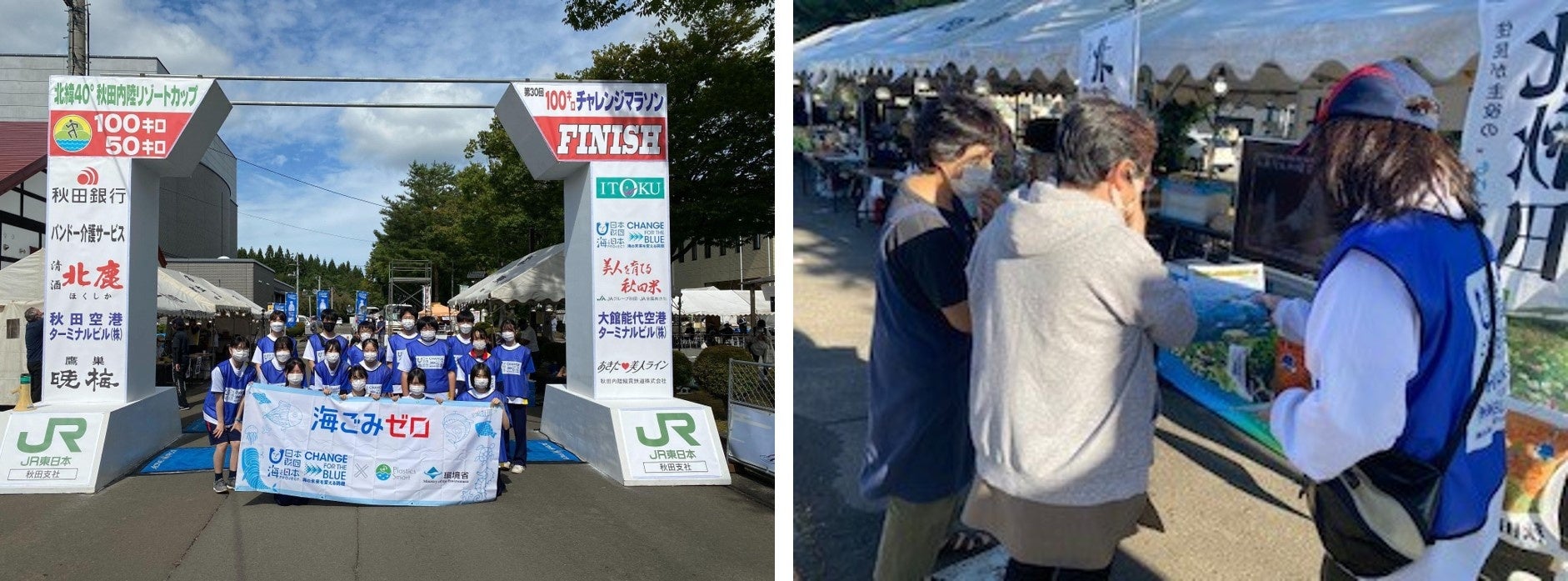 ランナーや応援以外に、大会に関わるスタッフや地元ボランティアはおよそ3000人以上となります。この大会を通してあきた海ごみゼロプロジェクト実行委員会は、ウルトラマラソンでのプロギングを実施するほか、スタートやゴールゲート、給水や休憩の為のエイドステーションなど様々な場所で「CHANGE FOR THE BLUE」ロゴの掲出をすると共に、大会前日23日(土)に行われる前夜祭や後夜祭ではCHANGE FOR THE BLUEブースを設置し、秋田の美しい海を守っていくために、ごみの分別・ポイ捨てストップを呼びかけるチラシやごみ袋の配布などの海洋ごみ削減の啓発活動を行います。また大会開催前の17日(日)には地元のボランティアやマラソン事務局の方々と、ランナーたちが綺麗なあきたの自然を感じ気持ちよく走れるようコース上の清掃活動を実施します。