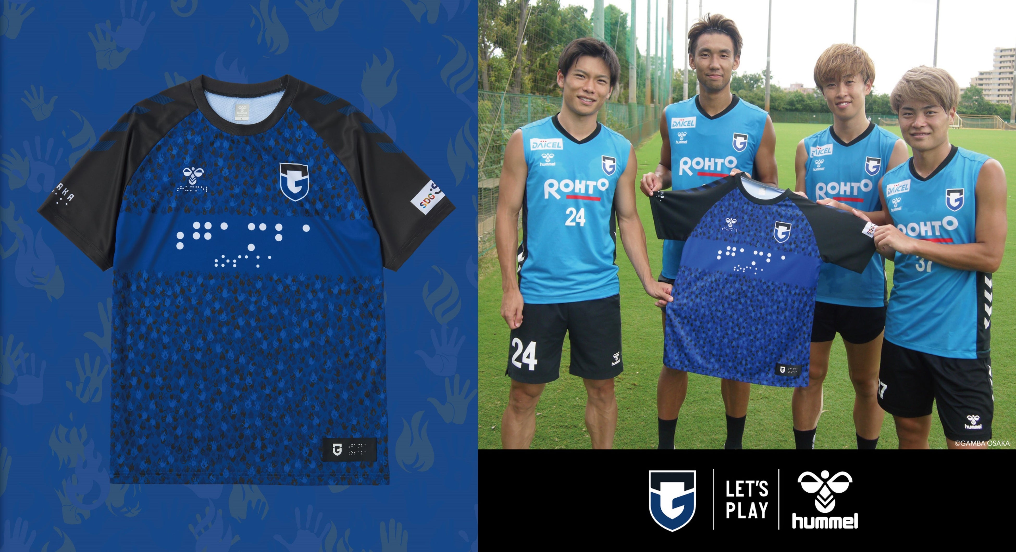 hummelとガンバ大阪で視覚障がい者支援に繋げる、点字加工を施したシャツを入場時に選手が着用します。