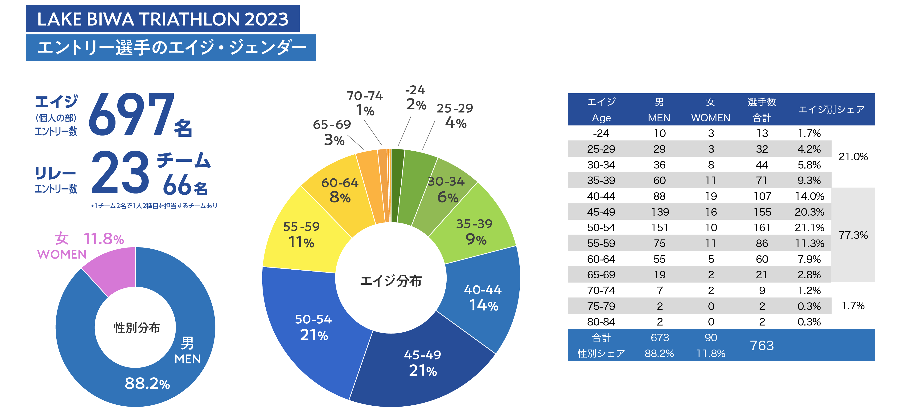 年齢区分では、40・50・60代の選手が全体の77%を占め、トライアスロンが生涯スポーツとしての位置付けとなりつつあることを見ることができます。