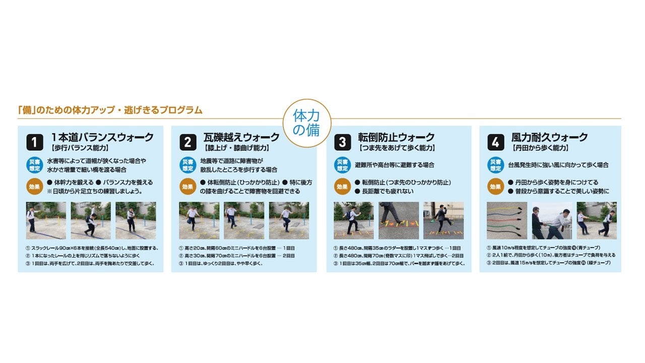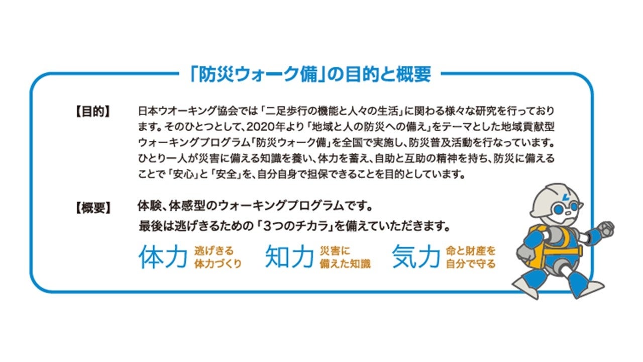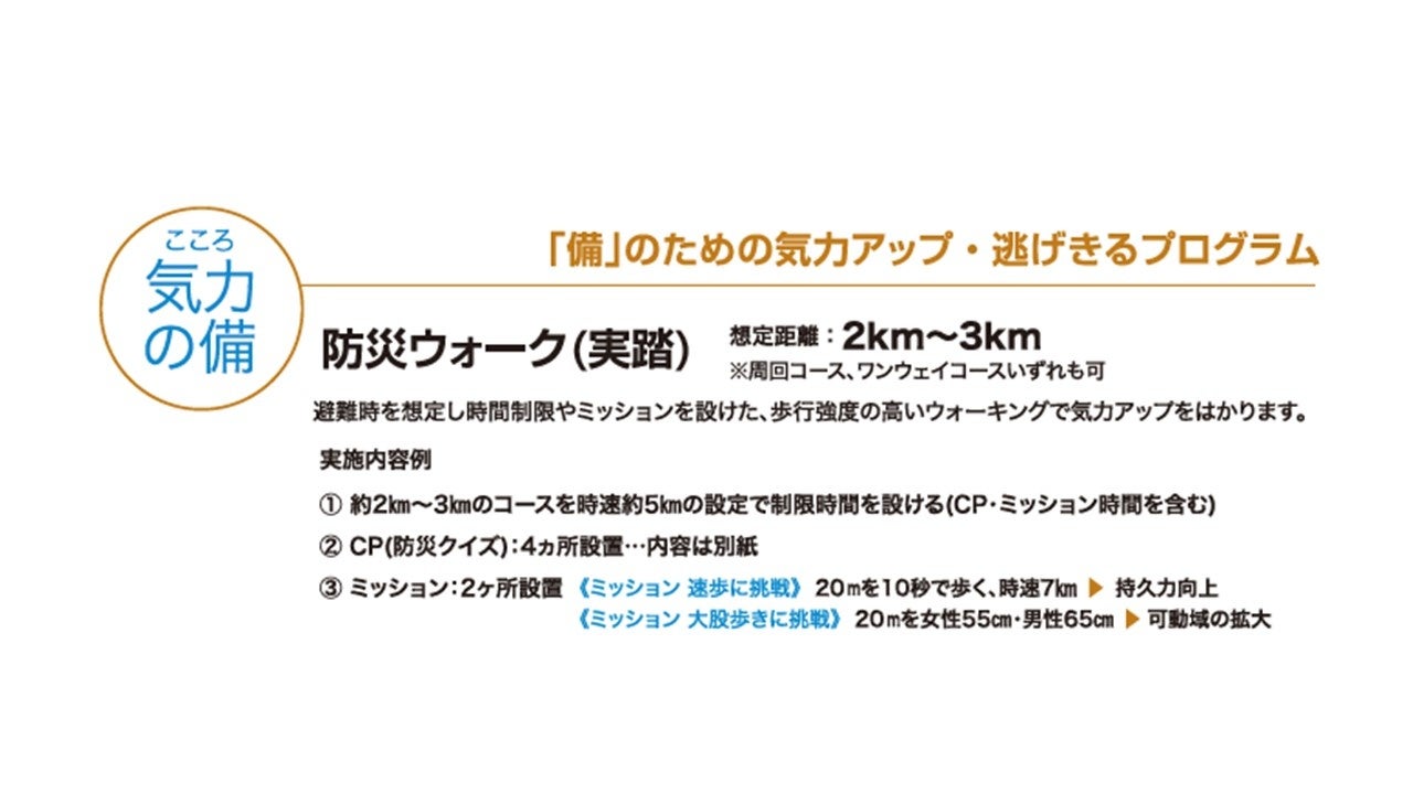 「防災ウォーク備」は、各地域ことに想定される災害の違いや地形・⼈⼝構成など、それぞれの地域こ との特徴を、主催者様と競技を重ね⽇本ウオーキング協会が保有するコンテンツの中から、最適なプログラムにて提供います。また、インストラクターの育成はイベントのみならず、もしもに備える地域防 災担当者の フォロアーとして⼼強い存在となっています。また、インストラクターの育成はイベントのみならず、もしもに備える