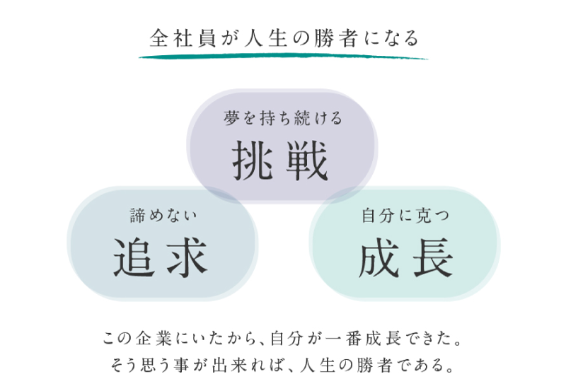 高い志とロマンを持って挑戦する。経営理念に込められた想いを胸に、Mission(使命)を果たすため、明確な目標に向かってチャレンジ精神をもって成長する社員一人一人が使命感と責任感を持ち「できない理由」を探すのではなく、「できる方法」を探す集団であれば、全社員とその家族の物心両面の幸福を追求できる企業となり、且つ社会から必要とされる企業となる。
