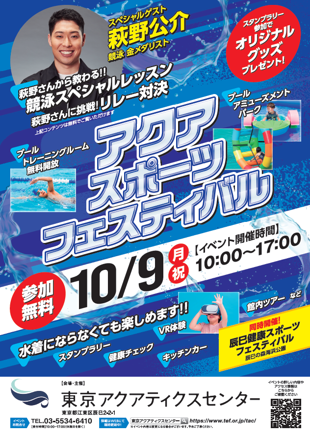 東京2020大会で水泳の会場となり、令和5年4月に再開業した東京アクアティクスセンターにて初開催となる本イベントでは、スペシャルゲストに競泳メダリストの萩野公介さんをお招きし、萩野さんのスペシャルレッスンや、萩野さんに挑戦するリレー対決などを行います。その他、パラスポーツの体験や、水着に着替えなくても参加可能なスタンプラリーなどのプログラムを行います。